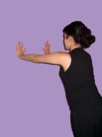 Standing crunches may also be done to strengthen the abdominals. Stand with the feet under the hips, toes pointed forward and knees slightly bent. One hand is placed on the stomach, the other on the buttocks. On an exhale, squeeze the stomach muscles while at the same time tucking in the buttocks. Inhale and release. Use a mirror to make sure the back flattens as you squeeze in the stomach (Figure 16).