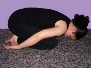 Kneel on the floor. Bring big toes together and separate the knees. Lower the buttocks onto the heels and bring the forehead to the ground. Bring the arms around to the side with the palms turned upward (Figure 9). Hold for several breaths. If you cannot reach the forehead to the ground comfortably, then bring your arms in front and rest your forehead on your stacked up hands.